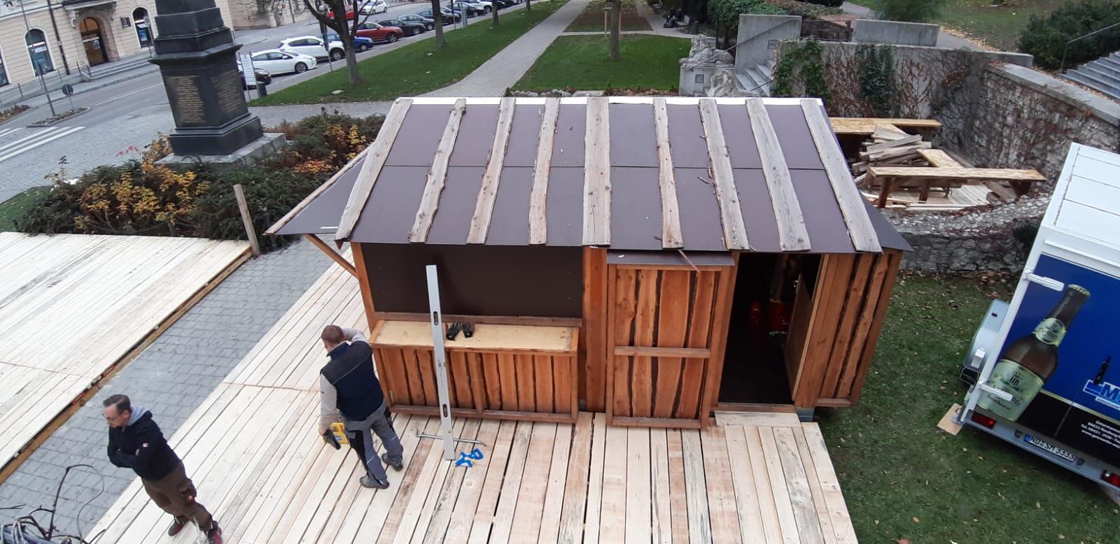 Vergangenen Samstag haben wir alle unsere Freunde und die fleißigen Helfer zusammengetrommelt und den Aufbau der Wichtelhütte am Hofgarten gestartet. Zuerst wurden die beiden Buden, der Rahmfleck-Stand von Ofen Ziegler sowie unsere Wichtelhütte angekarrt und auf ihren zukünftigen Standplatz abgesetzt. Anschließend haben wir dann mit dem Holzaufbau begonnen. Rund um die Wichtelütte am Hofgarten wollen wir nämlich noch Stehtische und Unterstellmöglichkeiten platzieren. Damit unsere Gäste dabei früher oder später nicht im matschigen Gras stehen müssen, haben wir ein Plateau aus Holz gebaut. Wir sind schon sehr gespannt, wie die vielen Neuerungen 2019 von euch aufgenommen werden!